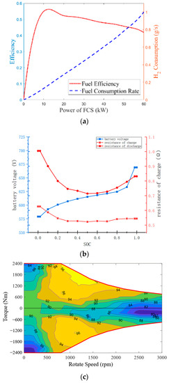 The relationship between the power system of the fuel cell bus is shown in Figure 2. The relationship between hydrogen consumption, efficiency and fuel cell power is shown in Figure 2a and is obtained by the interpolation method of the specific parameters of the vehicle. Figure 2b shows the power battery internal resistance characteristics. Finally, Figure 2c shows the relationship between the torque, speed and efficiency of the drive motor.