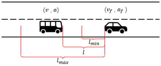 As shown in Figure 3, for this study, the fuel cell bus (target vehicle) is defined as driving in an urban expressway. This is because the relevant passenger car model is restricted by relevant traffic laws and regulations and can only drive in the far-right lane, while, in real traffic, other cars and other models in the environment may have different driving styles and driving routes, and are able to drive in any lane under the premise of ensuring their own safe and efficient driving. This means that the target vehicle inevitably faces the problem of replacing the car in front. In this scenario, the conventional car-following model may have some hidden dangers with regard to the safe driving problem. For example, the vehicle in the adjacent lane may jump in line to the front of the target vehicle, causing the target vehicle to follow the car and, as a result, the distance is suddenly reduced. Therefore, in order to ensure that the vehicle is capable of emergency braking safely in the event of an emergency, this paper uses the maximum and minimum follow-up distances to ensure the safe driving of the vehicle. The minimum follow-up distance is defined as (10).