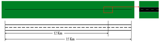 Through the traffic environment model established above, a simulation environment is built in the SUMO simulation software, and the specific road and vehicle parameters are shown in Table 4. In the simulation environment established in this paper, the detailed road design is shown in Figure 6.
