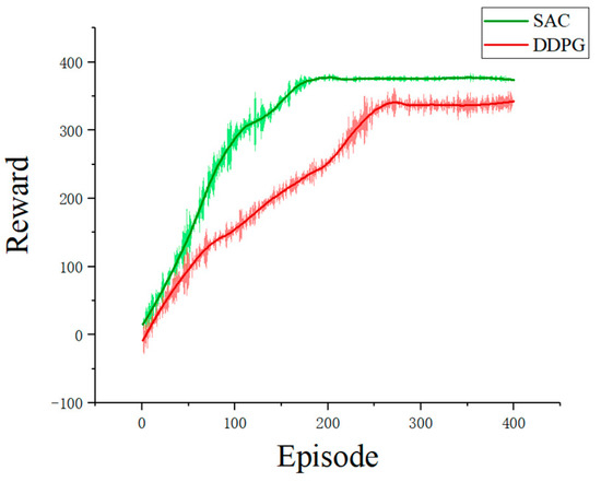 The DDPG algorithm adopts a deterministic strategy to select actions for environment exploration. This means that the exploration efficiency of the agent is lower than that of the SAC algorithm, so the convergence speed is slower. As can be seen in Figure 7, the SAC algorithm can complete the convergence of the reward function in 180 episodes, while the DDPG algorithm completed the convergence of the reward function in 260 episodes. At the same time, thanks to the principle of maximum entropy in the SAC algorithm, the SAC algorithm is more sufficient in the exploration of action selection, which also leads to the final convergence. The reward value has been improved compared with the DDPG algorithm, and the average value of the converged reward function has increased by 8.22%.