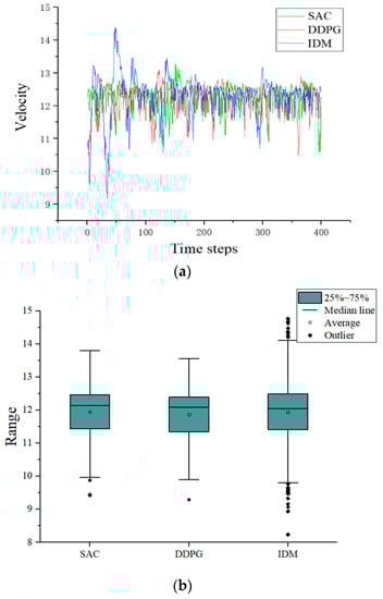 In terms of the speed control of hydrogen fuel cell passenger cars, the impact of the traffic environment designed in this paper on the driving of the target vehicle mainly comes from the driving of the original following vehicle of the target vehicle and the change of the following target caused by the entry of vehicles in adjacent lanes. In addition to the premise that the target vehicle must drive safely, smooth driving is also an important consideration. This paper uses the speed control model based on the DDPG algorithm to compare and analyze with the SUMO–IDM following model. The SUMO–IDM following model is a self-contained model in the SUMO simulation software. It is an intelligent driver model by Martin Treiber, one which has high generality and will adjust the driving speed of the vehicle in real time according to the distance and speed of the car in front to ensure more efficient driving. However, its driving style is extreme, and the vehicle acceleration changes are in a high range, which has a certain impact on comfort. The speed effect comparison is shown in Figure 8a, and the acceleration effect comparison is shown in Figure 8b. As can be seen from Figure 8a, the vehicle speed fluctuates greatly based on the IDM follow-up model, which makes the vehicle acceleration change more obvious. Therefore, in Figure 8b, there are more outliers under the IDM model.