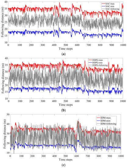 In terms of speed control, the following distance is also an important criterion. The maximum and minimum following distances proposed according to Equations (10) and (11) form a reasonable following distance interval. The target vehicle traveling in this interval is considered to be safe. The following distances of the three methods are shown in Figure 9. Figure 9a–c show the following distances under SAC, DDPG, and SUMO–IDM models, respectively.