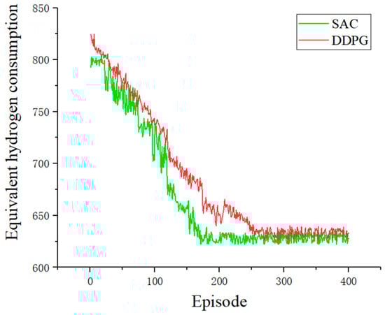 The EMS proposed in this paper is mainly aimed at the energy-saving optimization of equivalent hydrogen consumption and the reduction of fuel cell output power fluctuations. The reduction effect of the SAC algorithm compared with the DDPG algorithm for equivalent hydrogen consumption is shown in Figure 10. It can be seen in the figure that due to the difference in reward functions, once the two algorithms have converged, their equivalent hydrogen consumption levels are also different. The EMS based on the SAC algorithm is slightly better than the EMS based on the DDPG algorithm in the equivalent hydrogen consumption effect.