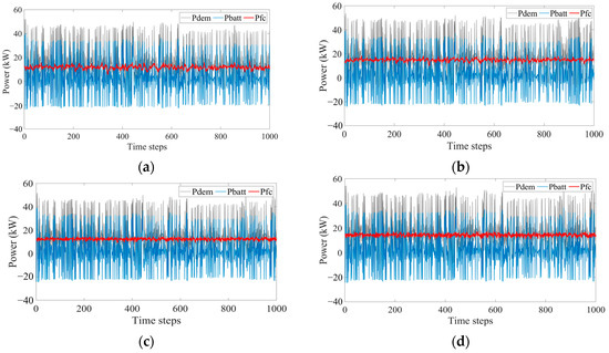Power under different EMS methods. (a) The power sources of DP; (b) The power sources of DDPG; (c) The power sources of SAC-OPT; (d) The power sources of SAC.