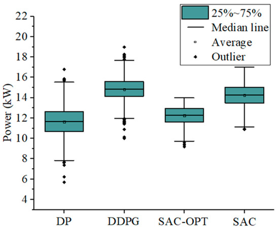 The traffic environment in this paper requires the hydrogen fuel cell bus to be in the expressway and to maintain a high speed. In the deep reinforcement learning algorithm, the text incorporates the fluctuation value of the fuel cell output power into the reward function, which effectively reduces the fluctuation of the fuel cell output power, which is critical for improving the life of the fuel cell. As shown in Figure 12 and Table 8, DP and DDPG have more outliers than the other two cases. Because the agent is more fully explored under the SAC strategy, it has a better ability to reduce output power fluctuations. The interval between the 75th percentile and the 25th percentile is the main fluctuation range. The fluctuation range of fuel cell output power under the DP strategy is 1.97 kW, while the fluctuation ranges of fuel cell output power under the DDPG, SAC and SAC–OPT strategies are 1.46 kW, 1.57 kW and 1.33 kW, respectively. Compared with the DP strategy, the SAC–OPT strategy with optimized action space has a fluctuation range of 32.65%. The optimization of the action space also ensures that the fluctuation range of the SAC–OPT strategy decreases by 15.29% compared with the SAC strategy.