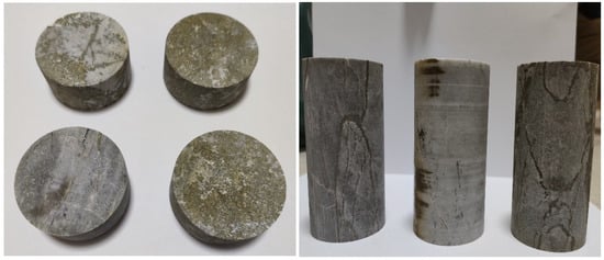An image of the samples is provided below as Figure 1. We processed the ore samples collected from the field into standard specimens in the laboratory. To ensure the accuracy and reliability of the experimental results, we conducted tests using four standard specimens for each mechanical parameter measurement. The obtained numerical values for the mechanical parameters represented the average values of the respective specimens. It is worth noting that the mechanical parameters of the specimens showed minimal differences among them.