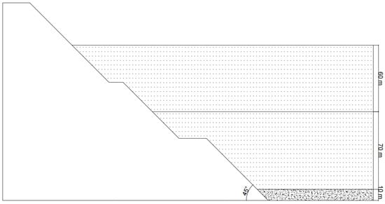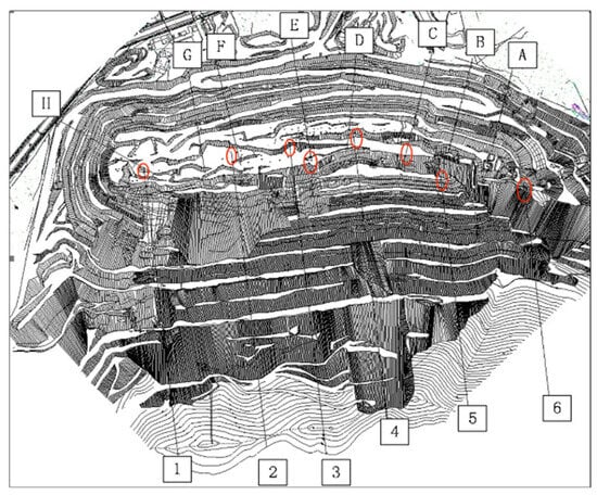 In order to facilitate monitoring and management, the previous mining operation divided the upper and lower slope profiles into sections, depicted in Figure 2. In this study, fourteen profile lines (A–H profiles of the upper wall and 1–6 profiles of the lower wall) were generally arranged vertically within a closed circular range from the eastern end of the upper wall slope to the eastern end of the lower wall slope. Preliminary site investigation and monitoring results indicated subpar stability for the upper wall slope C, E, and lower wall slope. Consequently, the analysis profiles selected were upper wall slope C, E profiles and lower wall slope sections 1–6. The backfilling plan for the open pit comprised the following: the pit’s bottom was backfilled at 10 m (with the 28-day uniaxial compressive strength of the solidified body 5 m above the pit bottom not less than 3.0 MPa, and the strength of the solidified body at 5–10 m not less than 2.0 MPa). Above the pit bottom, regular backfilling was employed at 10 m (the strength of the solidified body was not less than 0.5 MPa). The feasibility of dry pile consolidation could be considered later based on the backfilling effectiveness and underground ground pressure monitoring data. After backfilling to a depth of 110–150 m above the pit bottom, a further increase in backfilling height will have a negligible impact on the safety of underground mining. Consequently, for this open-pit slope stability analysis, the solidification and backfilling heights were 0, 10 (bottom), 80, and 140 m. The backfill layout is displayed in Figure 3.