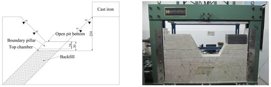 The process of slope stability analysis has somewhat simplified the boundary conditions. Consequently, this study employed a similar physical model to conduct strain testing on the waterlogged open-pit slope in order to further validate the reliability of the numerical simulation results. The primary objective of the model test was to replicate the impact of solidification and backfilling in the open pit on the safety performance of the upper and lower wall slopes. Therefore, the middle section of the open pit was selected for a similar simulation based on the actual occurrence form of the ore body and its relative position with the open pit. Due to the significant height of the footwall slope, the geometric similarity ratio (Cl) was determined to be 190, and a corresponding weight of an iron block was selected for similarity replacement. Materials of similarity were combined and mixed according to the ratio parameter to form a uniform slurry for layered pouring, with each layer having a height of 0.2 m. After pouring each layer, it was compacted and flattened to avoid bubbles in the model. Approximately 0.01 m of water was added to the bottom of the similar model pit every 0.5 h to crudely simulate the impact of backfill water on slope stability. The model test mainly monitored the strain situation of the upper and lower wall slopes during the solidification and backfilling process. The layout of the measurement points and the physical model are shown in Figure 4. The strain measurement points 1# and 2# were arranged on the upper slope of the open-pit model, while the strain measurement points 3# and 4# were arranged on the lower slope of the open pit, as shown in Supplementary Materials Table S3.