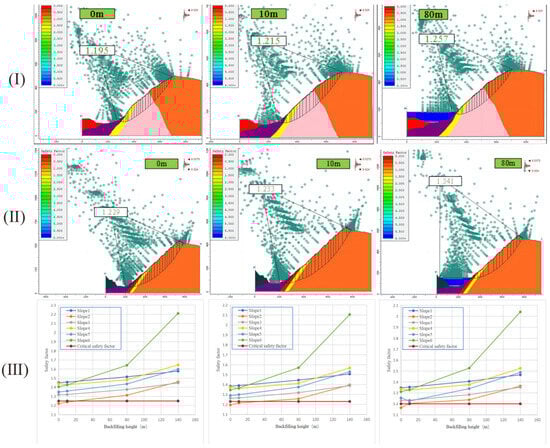 Figure 7 shows a slide analysis of some sections under different operating cases considering seepage field conditions. As the backfill height increases and the load on the slope increases, the water channel between the slope and the pit bottom/surface decreases, thereby reducing the impact of water seepage on the stability of the slope [,,]. In summary, considering the effect of the seepage flow field, the stability evaluation conclusions for open-pit slopes with different backfill heights are as follows.
