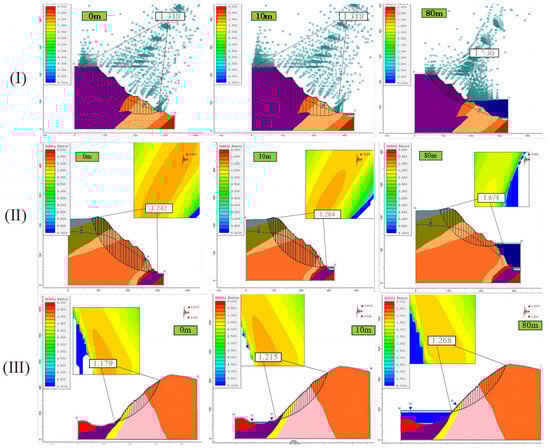 (I) Safety factor of section 2 slope under blasting Condition (II); (II) considering seismic condition (Condition (III)) 3 profile slope safety factor; (III) safety factor of the slope for sections 1–6 under normal working conditions (working Condition (I)), blasting working conditions (working Condition (II)), and seismic working conditions (working Condition (III)).