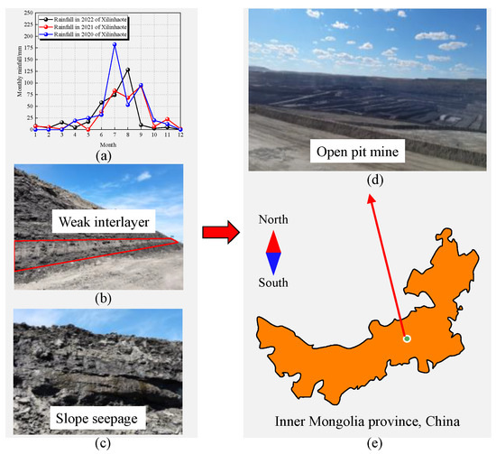 Engineering background: (a) The monthly precipitation in Xilinhot, (b) the position of the weak interlayer, (c) the seepage phenomenon on the open-pit mine slope, (d) the panoramic view of the open-pit mine slope, and (e) the geographical location of the open-pit mine slope.