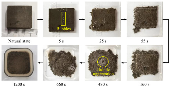 The whole process of the mudstone sample disintegration in water is illustrated in Figure 2. After 5 s, a large number of bubbles appeared in the water and the surface of the rock sample reacted rapidly with the water, forming a honeycomb-like structure. After 55 s, significant particles and massive disintegration were generated on the rock surface. After 480 s, there were no apparent large-volume blocks on the external surface of the sample, but a cluster of bubbles was floating on the water surface. At 660 s, a large internal block in the upper-left corner of the sample disintegrated, and thereafter, there were no significant large blocks inside or outside the sample. The disintegration rate noticeably decreased. After being left undisturbed for 1200 s, the disintegration process was complete, and the water became turbid.