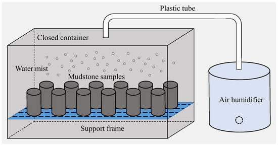 Hence, it can be inferred that the conventional water immersion method would cause significant soaking damage to the mudstone studied in this research. Therefore, a non-destructive water immersion method was employed to treat the mudstone. The non-destructive water immersion device consists of an air humidifier and a closed container, as shown in Figure 3. The air humidifier provides a constant temperature and humidity water environment, immersing the mudstone in the form of water mist, thus avoiding the disintegration of the rock samples inside the sealed box.