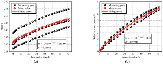 Water absorption changes in immersed mudstone: (a,b) represent the mass and the relative water content, respectively.