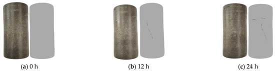 The changes in surface cracks of the mudstone under different immersion times are depicted in Figure 7. It can be observed that at 0 h of water immersion, there are no apparent cracks on the rock’s surface. After 12 h of immersion, longitudinal tensile cracks appear in the middle of the surface, with a length of about 3.5 cm and a width of approximately 0.2 mm. By the 24th hour of immersion, these longitudinal cracks further develop and expand at an angle of around 70°, reaching a length of about 4 cm. Additionally, two small longitudinal cracks emerge on the upper part of the rock, with lengths ranging between 1 and 1.5 cm. These cracks are horizontally distributed and not fully connected, indicating relatively good overall stability of the sample. When the immersion time reaches 36 h, a transverse tensile crack with an angle of 135° forms and extends in the upper part of the sample, with a length of about 4 cm and a width of approximately 0.2 mm. After 48 h of immersion, the surface cracking intensifies, and the crack width and length increase. The longitudinal tensile cracks gradually extend towards the cross-section of the rock at a specific angle of around 70° but do not fully penetrate it. Finally, at 72 h of water immersion, the longitudinal tensile cracks on the surface propagate along the 70° angle, forming macroscopic through-cracks with significantly increased lengths, widths, and depths compared to 48 h. Cracks in the sample exhibit an interwoven distribution both horizontally and vertically.