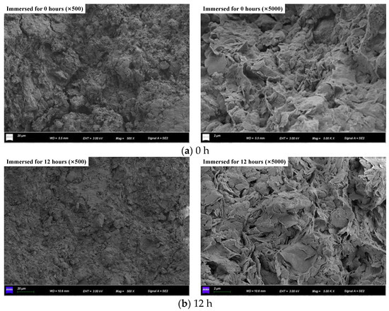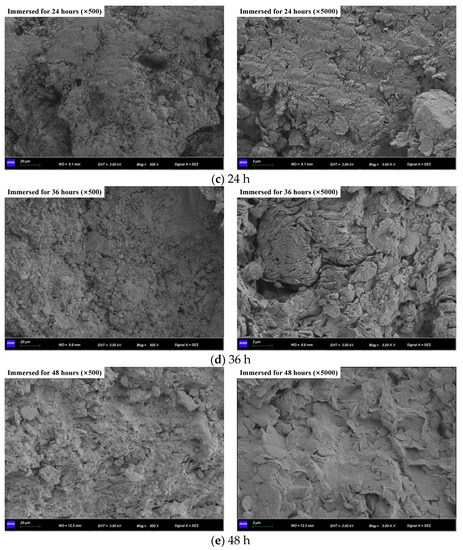 The mesoscopic structural changes of the mudstone under different water immersion times were observed through SEM scanning. The SEM images at various magnifications are shown in Figure 8.