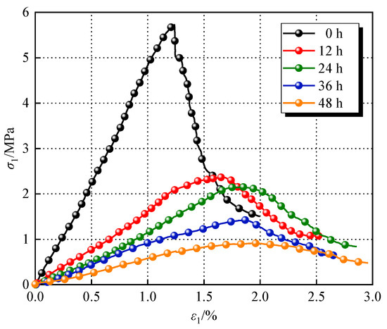 The uniaxial compression stress–strain curve of the rock sample can reflect the failure process to some extent. The variations of the uniaxial compression stress–strain compression curve of the mudstone are illustrated in Figure 9. In addition the uniaxial strength (UCS), elastic modulus (E), and peak strain () of the mudstone with different immersion times are shown in Table 1. The results show that the evolution of the stress–strain curves during uniaxial compression of the mudstone under different immersion times exhibits consistency and can be divided into four stages: compaction stage, elastic stage, plastic stage, and post-peak failure stage.