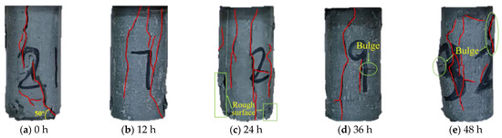 The common modes of uniaxial failure in rocks vary depending on the rock type and can be classified into three types: tensile failure, shear failure, and tensile–shear mixed failure. Figure 10 shows the uniaxial compression failure mode of mudstone after different immersion times (0 h, 12 h, 24 h, 36 h, 48 h). It can be observed that in the natural state, the mudstone primarily exhibits a mixed mode of tensile–shear failure, with a distinct tensile crack initially transitioning into shear cracks at an angle of approximately 50°. After 12 h of water immersion, the number of failure cracks slightly increases and penetrates each other, with tensile failure being the dominant mode of failure. After 24 h of water immersion, there is a significant increase in the number of tensile cracks, and the side surface shows fragmentation and spalling, resulting in a rough surface. After 36 h of water immersion, the mudstone exhibits significant shear dilation characteristics, and a localized bulging on the surface leads to fragmentation and spalling of the rock mass. After 48 h of water immersion, two occurrences of bulging and spalling of rock blocks are observed on the side surface due to shear dilation. Additionally, there is an increase in the number of small-scale cracks, and the cracks intersect vertically and horizontally.