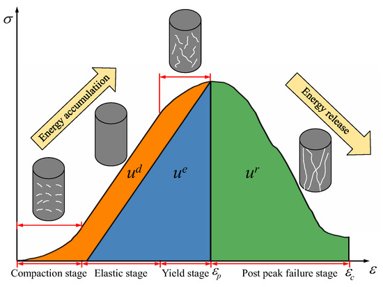 In order to fully reveal the failure mechanisms of mudstone under uniaxial compression under different water immersion times, an explanation can be provided from an energy perspective [47,48]. During the uniaxial compression process, the work done by the external environment on the rock sample represents the total input energy. Neglecting energy losses in a closed thermodynamic system, all the energy is absorbed by the rock sample and transformed into elastic energy and dissipated energy. The elastic energy represents the strain energy stored in the rock itself, while the dissipated energy is closely associated with the closure, propagation, and interconnection of cracks within the rock. During the post-peak failure stage of the rock, the stored strain energy is released, leading to crack interconnection and instability in the internal structure of the rock. The theoretical energy evolution process during the loading of the rock is illustrated in Figure 11. The relationship between energy and compression in mudstone can be expressed as follows [49]: