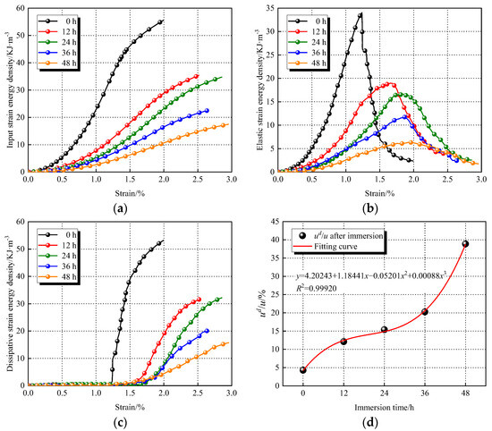 Energy evolution characteristics of mudstone under different water immersion time: (a) input strain energy, (b) elastic strain energy, (c) dissipative strain energy, and (d) the proportion of pre-peak dissipated energy to total input strain energy.