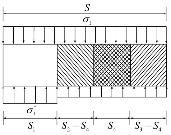 Based on the assumption of strain equivalence, a geometric damage constitutive model for the interaction of water immersion and loading was established. The model divides the infinitesimal element into four parts: the undamaged region, the immersed damage region, the loaded damage region, and the immersion–load damaged region, as shown in Figure 13. The nominal stress and total area of the infinitesimal element are denoted as and S, respectively. The effective stress and area of the undamaged region are denoted as and S1, respectively. The areas of the immersed damage region, loaded damage region, and immersion–load damaged region are denoted as S2, S3, and S4, respectively.