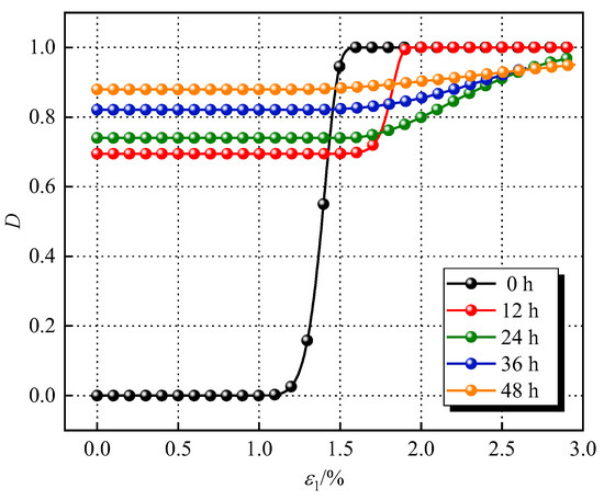 The evolution of damage variables of water-immersed mudstone under uniaxial loading is illustrated in Figure 14. It is evident that the initial value of the immersion damage variable, D1, gradually increases with the increasing immersion time. Furthermore, the overall total damage, D, exhibits a characteristic “S”-shaped trend.