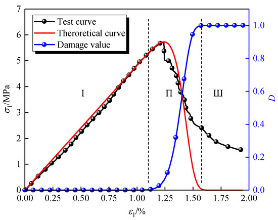 (3) Residual damage stage: the damage variable reaches a plateau and stabilizes at 1. During this stage, macroscopic cracks have formed, and the internal structure of the rock is completely disrupted. The rock is unable to maintain its original shape under external loading.