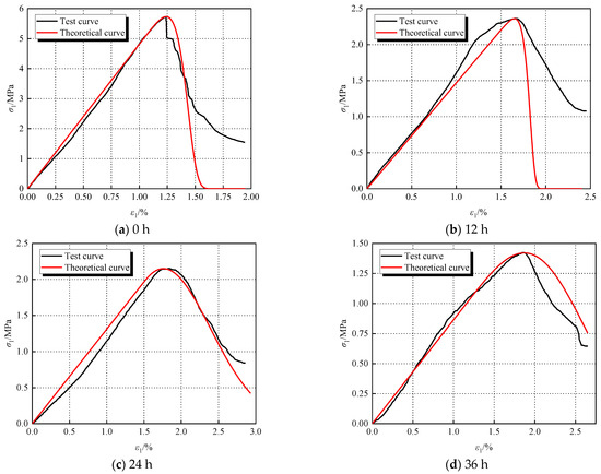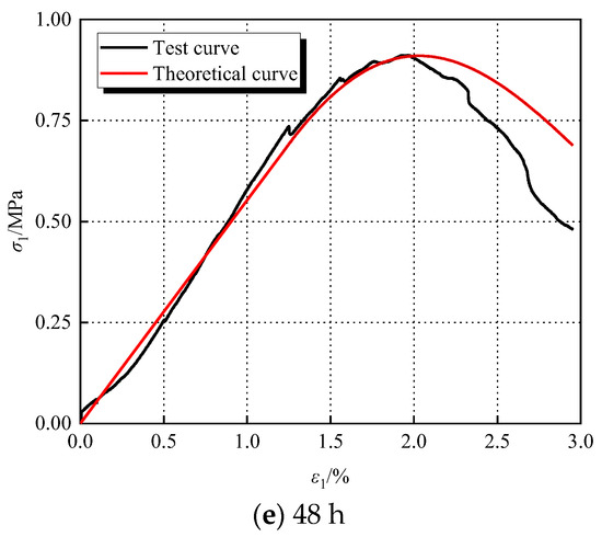 The comparison between the theoretical and experimental curves of uniaxial compression for different immersion times of the mudstone is shown in Figure 16. It can be observed that the proposed uniaxial compression model in this study effectively describes the stress–strain relationship of immersed mudstone, which validates the correctness and rationality of the model proposed in this study. However, it should be noted that the theoretical model cannot reproduce the compaction stage and the residual stage during the loading process.