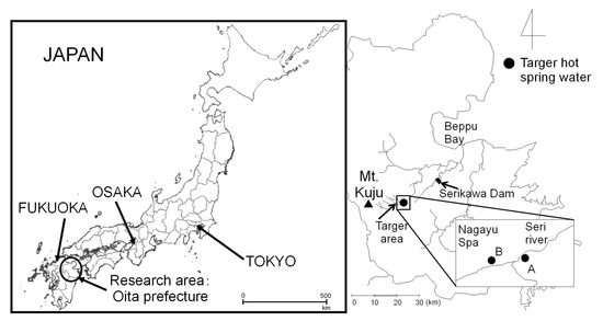 Study area and hot spring water (Hot Spa A and Hot Spa B). This map is based on the Digital Topographic Map published by Geospatial Information Authority of Japan of Ref. [42].