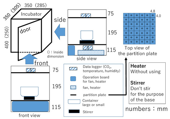Experimental conditions were the amount of hot spring water (i.e., 500, 1000, and 2000 mL), closing the door, and running or stopping the fan. The size of the containers containing the hot spring water were 159 mm × 124 mm × 80 mm for 500 mL and 1000 mL, 276 mm × 152 mm × 93 mm for 2000 mL. The time of the demonstration experiment meant from the start of the experiment to the end of the experiment. The reason for conducting the experiment under closed-door conditions was to prevent the air in the incubator from exchanging with the outside air. However, CO2 concentration, temperature, and humidity in the incubator replaced the outside air when the next experiment was performed in the same incubator. The heater was not in operation because it is assumed to be applied to actual greenhouse horticulture.