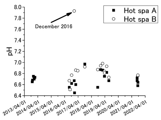 The results of ORP were the measured data, not corrected to the hydrogen electrode potential. The investigation period was November 2013 to September 2021 for pH and November 2013 and July 2019 for the other chemical components. Sample number is shown in the table. The averages and standard deviations of pH and water temperature in the tables were calculated from the results of Figure 3 and Figure 4. pH showed between 6.4 and 7.0, except 7.9 for Hot Spa B in December 2016. The pH of Hot Spa A in the same month was 6.7. It was difficult to determine the cause. Forms of carbon dioxide contained in hot spring water are generally carbonate ion (CO32−), bicarbonate ion (HCO3−), and free carbon dioxide (H2CO3 or CO2 (aq)). The proportion of each carbon dioxide can be calculated by pH, except a strongly acidic hot spring water. The proportion of free carbon dioxide is highest when the pH value is between 4 and 6.5 [46]. The proportion of bicarbonate ions increases when the pH value exceeds 6.5. Free carbon dioxide is completely changed to carbonate and bicarbonate ions when the pH value exceeds 8.3. The average of pH values of Hot Spas A and B were 6.7 and 6.9. This pH showed a high proportion of bicarbonate ions and free carbon dioxide, although it was outside of the highest value for the percentage of free carbon dioxide. Water temperature for Hot Spa A was around 40 degrees, and Hot Spa B was around 50 °C. Water temperatures tended to be higher during periods of high air temperatures. Conversely, water temperatures were high when air temperatures were high. The water temperature of Hot Spa A was 30.8°C in July 2020, which was about 10 °C lower in annual fluctuations. Hot Spa A was inundated by flooding the of the Seri River near Hot Spa A before the survey in July 2020. It presumes that this was a factor in the temporarily low water temperature. ORP showed a negative value, indicating that the subject hot spring water is in a reduced state. Since much of a subsurface is a reducing environment with poor oxygen, it is possible that it has existed underground for an unknown period of time and has been affected in some way underground. Based on the above, since the target hot spring water contains free carbon dioxide, it is possible to verify the increase in atmospheric CO2 due to free carbon dioxide. In addition, the water temperature is as high as 40 °C or 50 °C, which means that the groundwater can be utilized as a resource.