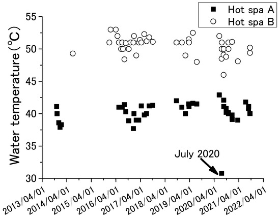 Annual fluctuations of water temperature for Hot Spa A and Hot Spa B.