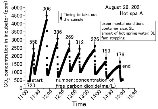 Figure 5, Figure 6, Figure 7 and Figure 8 show concentration fluctuations for free carbon dioxide in hot spring water and CO2 in the incubator. The horizontal axis shows the time of the experiment and the vertical axis shows the CO2 change in the incubator as measured by the CO2 data logger. The experiment in Figure 5 was conducted for the longest time, more than 4 h, while the rest of the experiments in Figure 6, Figure 7 and Figure 8 were completed within 2 h. For Figure 6, Figure 7 and Figure 8, the experiment was terminated because the concentration of free carbon dioxide in the hot spring water had decreased. The amounts of hot spring water were 1000 mL, 2000 mL, and 3000 mL using a 1000 mL vessel (i.e., 159 mm × 124 mm × 80 mm) and 2000 mL vessel (i.e., 276 mm × 152 mm × 93 mm; it can hold over 3000 mL). The time intervals for measuring free carbon dioxide were indeterminate. The down arrows in the figure indicate the timing for the measurement of free carbon dioxide, hence the caption “Timing to take out the sample” as taking the time the sample was entered for these figures. The operation method of the fan was different depending on the experimental conditions, as shown in the figure. The phenol check in Figure 8 meant that the concentration of free carbon dioxide was not 0 mg/L, but it was a very small concentration. If the sample color turns red when a phenolphthalein solution was added to the sample, it means that it does not contain free carbon dioxide (JIS K 0102:2013, Japan Industrial standard) [43]. The red color of the end point was not observed when the phenolphthalein was added to the sample for measuring free carbon dioxide. The sample turned red color when a small quantity of sodium hydroxide was added, but it was difficult to measure the titration volume with a burette. Therefore, these samples were designated as a phenol check in this paper. To measure free carbon dioxide contained in the hot spring water, the door was opened to take the container with hot spring water from the incubator. For the analysis of free carbonic acid, the amount of hot spring water necessary for the measurement was taken from the container. The container was then returned to the incubator and the door was completely closed. This incubator exchanged the inside air and outside air less when its door was closed. The air in the incubator and the outside air were exchanged while opening the door.