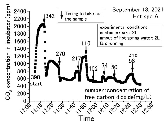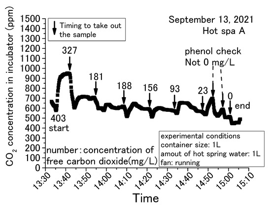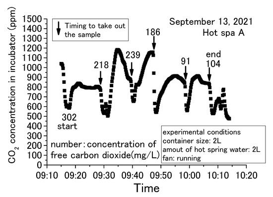 The common trend in Figure 5, Figure 6, Figure 7 and Figure 8 is that the CO2 in the incubator decreased when the sample was taken out of the incubator. It could be assumed that the concentration decreased by opening the door and exchanging the air inside the incubator with the outside air. The decreased CO2 concentration increased when the hot spring water was returned to the incubator and the door was closed. This trend could be confirmed over and over again. In this demonstration experiment, there was no supply of CO2 from sources other than the hot spring water.