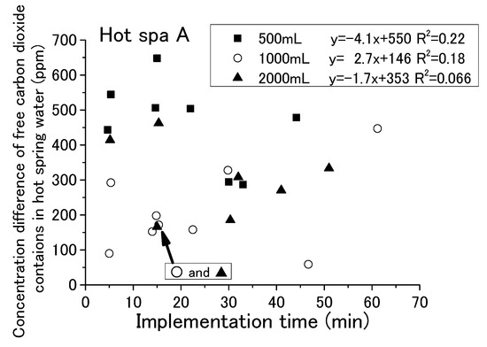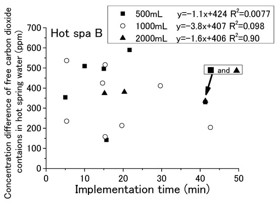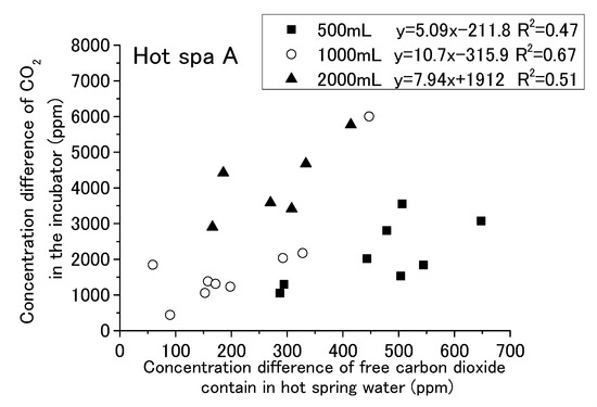 The results are shown for Hot Spa A and Hot Spa B, divided into 500, 1000, and 2000 mL of hot spring water. The coefficient of determination for Hot Spa A found a slight correlation that was over 0.47 (i.e., 0.47, 0.51, and 0.67). The slope showed 5.09 and 10.7 in the results of 500 mL and 1000 mL. However, it showed 5.09 and 6.76 as the numerical value of an approximation except the concentration differences 1846 and 6000 ppm. Relationships of 500 mL and 1000 mL showed a continuous trend bordering on 300 ppm for the concentration of free carbon dioxide. The intercept of 2000 mL was markedly different from 500 mL and 1000 mL. For Hot Spa B, the coefficient of determination for 500 mL showed the relationship. However, 1000 mL and 2000 mL showed almost no correlation (i.e., the coefficients of determination were 0.0016 and 0.22). Part of the 2000 mL sample showed results of a more than 7000 ppm difference for CO2 concentration. It was well deviated from other trends. Hot Spa B did not show clear differences in trends compared with Hot Spa A. Based on the above, the coefficient of determination results showed a relationship for the same amount of water. For the different amounts of water, the slope was almost the same for Hot Spa A, except for the significant outlier values. However, the intercepts yielded different results. Therefore, it was a possible that the amount of water has some effect on the intercepts. Therefore, it was necessary to consider what trends would be observed if converted to the same amount of water. In addition to the amount of hot spring water, the concentration of free carbon dioxide may have an effect on the results, so it was necessary to consider the trend per 1 ppm of free carbon dioxide.