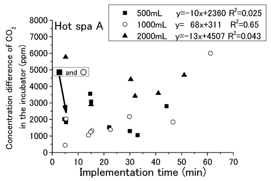 With each passing hour of the experiment, the free carbon dioxide in the hot spring water decreased and the CO2 concentration in the incubator increased. Some relationship was shown for the running or stopping of fan operation and the amount of hot spring water. It has not yet been possible to determine a relationship by time of implementation. For checking the change in free carbon dioxide in hot spring water with time in the experiment, it is shown in Figure 9 and Figure 10 that the implementation time in the demonstration experiment and concentration difference of free carbon dioxide contained in hot spring water as Hot Spa A and Hot Spa B before and after the experiment. In addition, for checking the CO2 changes in the incubator over the time of the experiment, the implementation time in the demonstration experiment and the concentration difference of CO2 in the incubator before and after the experiment when Hot Spa A and Hot Spa B are set in the incubator are shown in Figure 11 and Figure 12. The data covered are those with an experimental duration of 70 min or less in which free carbon dioxide remained. Hot Spa A was selected for less than 70 min, and Hot Spa B was selected for less than 50 min. Also, for checking the impact of different water volumes, these figures were shown separately for each amount as 500 mL, 1000 mL, and 1500 mL of hot spring water. In the caption, it shows the values for each amount of water and the equations and coefficients of determination for each amount of water. The fan is running as an experimental condition. Experiments were conducted at different implementation times for confirming the trend of concentration difference by time of implementation. The slope of the correlation equation showed a negative value, except 1000 mL in Figure 9, 1000 mL in Figure 11, 500 mL in Figure 12, and 1000 mL in Figure 12. The negative values, shown Figure 9 and Figure 10, meant that the amount of emitted free carbon dioxide from hot spring water was higher at the beginning of the experiment. The reason for the greater emission at the beginning of the experiment was that the partial pressure of the hot spring water was higher, making it easier for CO2 to be emitted. It could be assumed that as time passes, the partial pressure difference with the air in the incubator became smaller and less likely to be emitted. The efficiency for emitting of free carbon dioxide was found to be low even after the experimental time was becoming longer. The negative values shown in Figure 11 and Figure 12 meant that shortening the time of the experiment increased the increment quantity of CO2 concentration in the incubator. A shorter experimental time was more efficient for the emitting of free carbon dioxide from the hot spring water and for the increase in CO2 concentration in the incubator. The coefficient of determination was 0.50 or higher on the numbers. There were few cases that showed a clear tendency such as a proportional relationship because there were some results in which the execution time was different even with the same concentration difference. Those results were the same change even if it checked the difference in the amount of hot spring water. Therefore, the implementation time in the demonstration experiment had no influence on the change of the concentration for free carbon dioxide and CO2 concentration in the incubator. Although the slope of the equation was positive and the coefficient of determination was low, it was possible that a short period of time was ideal for the efficient emitting of free carbon dioxide from hot spring water and for the efficient rise of CO2 concentration in the incubator. In other words, replacing the hot spring water in a short period of time may be more efficient.