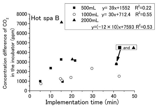 The volume inside the incubator was 2.17 × 107 mm3. The increasing concentration of CO2 in the air was 8.3 ± 2.5 (Hot Spa A) and 7.2 ± 4.4 (Hot Spa B) for per 1 ppm of free carbon dioxide in 1000 mL of hot spring water. It was possible to obtain the necessary CO2 concentration by changing the amount of hot spring water introduced. The concentration in the greenhouse could be further increased when all free carbon dioxide becomes the CO2 in the incubator. For example, if there was 100 ppm of the free carbon dioxide contained in the hot spring water, then the CO2 concentration in the greenhouse was increased 580–1080 ppm (calculation formula: (8.3 − 2.5) × 100 ppm to (8.5 + 2.5) × 100 ppm). It was possible to increase the concentration from 290 to 540 ppm after circulating the air when the volume of a target facility or plant factory was twice as large as the incubator. If this amount of the CO2 increment was not enough, it could be applied by increasing the amount of hot spring water in the facility because increasing the amount of hot spring water increased the emission amount into the air for 1 ppm of free carbon dioxide, as is shown in the results in Figure 19 and Figure 20. In the case of Hot Spa A, the increase to 1 ppm free carbon dioxide in 2000 mL of water was 16.2 ± 4.4. It meant it could be increased from 1180 to 2060 ppm for 100 ppm. In this case of twice the volume of the incubator, it was possible that the CO2 concentration could be increased by 590–1030 ppm. A volume 1000 times larger would increase the CO2 concentration by 1.180 to 2.060 ppm; however, it was a very small amount. Therefore, it will use these findings of this study. For example, if a facility wants to increase the CO2 concentration by 500 ppm, multiply the rate of increase in the concentration of free carbon dioxide by the rate of increase in the amount of hot spring water, which should be 242.7 to 423.7 times. As an example calculation, with three times the concentration of free carbon dioxide (300 ppm), by increasing the amount of hot spring water by a factor of 80.9 to 141 (162 to 282 L), the target concentration of 500 ppm could be increased.