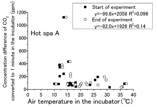 Relationship between air temperature in the incubator and concentration difference of CO2 converted in 1 min in the incubator (Hot Spa A).