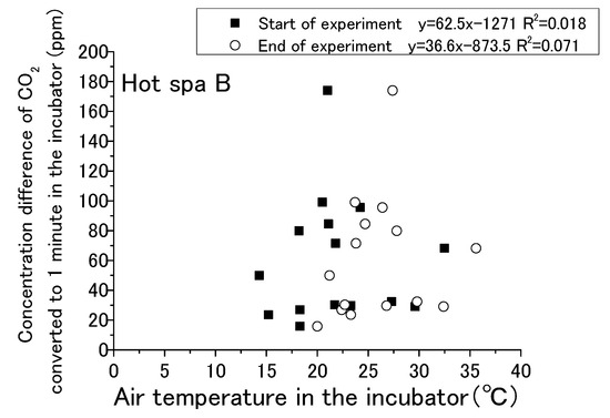 Relationship between air temperature in the incubator and concentration difference of CO2 converted in 1 min in the incubator (Hot Spa B).