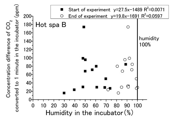 Relationship between humidity in the incubator and concentration difference of CO2 converted in 1 min in the incubator (Hot Spa B).