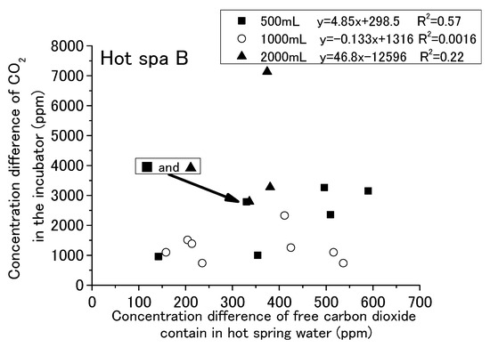 Relationship between concentration difference of free carbon dioxide contained in hot spring water and concentration difference of CO2 in the incubator (Hot Spa B).