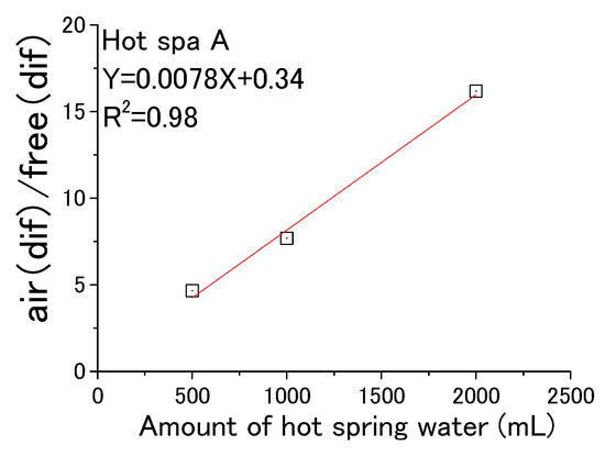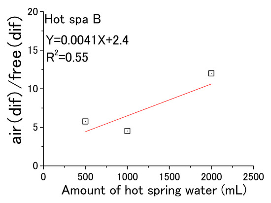 From the above, Figure 19 and Figure 20 were created based on the relationship between air (dif) and free (dif) in Table 3. Hot Spa A in Figure 19 showed y = 0.0078X + 0.34 (coefficient of determination; R2 = 0.98). It meant that air (dif)/free (dif) increased in proportion to the amount of hot spring water. Hot Spa B in Figure 20 showed y = 0.0041X + 2.4(coefficient of determination; R2 = 0.55). Although the coefficient of determination was 0.55, the value was low when the amount of hot spring water was 1000 mL. Therefore, it was hard to prove that there was a correlation for Hot Spa B.