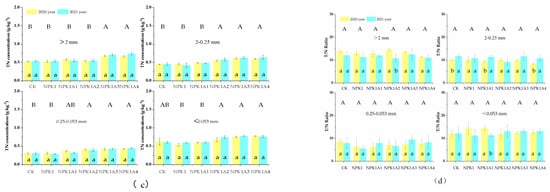 Effect of attapulgite application on carbon and nitrogen content in aggregates; (a) the effect of attapulgite application on the content of organic carbon in aggregates of each particle size; (b) the application of attapulgite on the content of inorganic carbon in aggregates of various particle sizes; (c) effect of attapulgite application on total nitrogen content in aggregates of each particle size; (d) effect of attapulgite application on carbon–nitrogen ratio in aggregates of various. The data in the figure are mean ± standard deviation, and different capital and lowercase letters indicate that the difference between different years under the same treatment is significant at the p < 0.05 level.