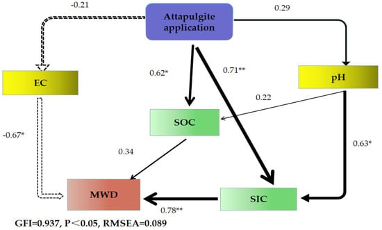 Structural equation model explaining the effect of attapulgite application rate on soil physical and chemical properties. Arrows indicate correlation; numbers indicate path coefficients; * indicates that the correlation is significantly different (p < 0.05); ** indicates that the correlation is extremely significant (p < 0.01). SOC: soil organic carbon, SIC: soil inorganic carbon, EC: Electrical conductivity, MWD: mean weight diameter.