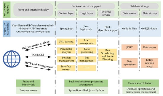 In order to ensure the security of business functions and data and consider the maintenance cost and development efficiency of the system, the system adopts the B/S (browser/server) architecture design with frontend and backend separation. This allows the system user to enter the system directly through the browser and easily use the system functions. At the same time, the database storage is used as a data storage mode, and the interface is not exposed to the outside world to ensure data security. In fact, the backend server provides services such as interfaces and algorithms for the frontend, making the data interaction and function invocation between the frontend and the backend smooth. The database storage [41] focuses on providing data access and data storage functions for the entire system for the backend, ensuring reliable storage and efficient management of data. This architecture is designed to provide an efficient, secure, and easy-to-maintain system environment that enables users to use the system smoothly and ensures data integrity and availability. The overall architecture of the system is depicted in Figure 2.