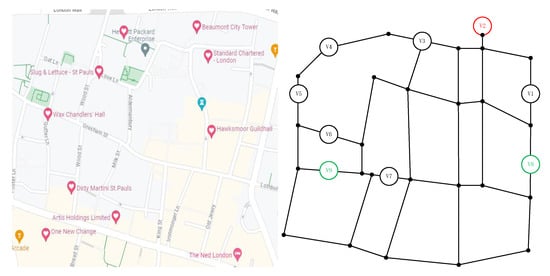 The original abstraction method is utilized to abstract the existing real-world transportation station map. The original abstraction method is a method to simplify and abstract the complex traffic station diagram in the real world. Its purpose is to describe the road network form between stations more intuitively by transforming the spatial position relationships, such as stations, sections, and intersections, into topological structures. In this process, stations can be abstracted as critical network nodes and intersections as critical nodes, and sections of the road between nodes can be represented by connecting edges [45]. The latitude and longitude coordinates of the intersection nodes are extracted and stored for future use. Taking the UK shared bus dataset used in this study as an example, the process is illustrated in Figure 3. The stations on the left side of the figure are abstracted as key network nodes (), while the intersections are represented as black key nodes on the right side of the figure. The street segments connecting the nodes are abstracted as edges in the station topology graph. Notably, stations and serve as departure points, and functions as the destination station. By transforming the map of the real world into an abstract topology and applying the information of these key nodes and edges to the blockchain-based intelligent traffic service scheduling management system, this abstract way enables the system to better deal with the complex traffic network and quickly and accurately find the optimal vehicle scheduling and route planning scheme, which brings many benefits to the field of traffic management. This includes reducing operating costs, improving vehicle utilization, ensuring the passenger travel experience, and making an important contribution to improving the quality and efficiency of transportation services.