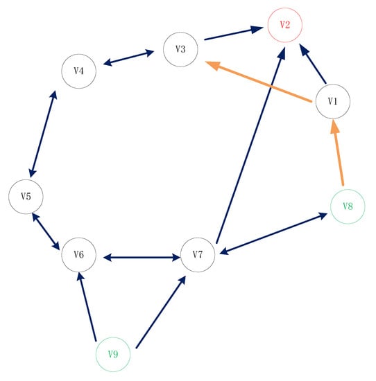 Lastly, the four edges mentioned above, namely , , , and , are removed. This results in an optimized directed graph of traffic stations suitable for bus operations, as illustrated in Figure 4 below.
