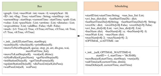 Firstly, this algorithm module requires inputs such as the order dataset, the maximum waiting time for passengers , and the number of seats on the bus . It defines the class, representing the bus vehicle, and the class, responsible for managing the bus operations, as shown in Figure 5 of the following class. Additionally, it initializes the global best waiting time as infinity and the global tabu list and local tabu list in the format , where represents the maximum waiting time for passengers at that station.
