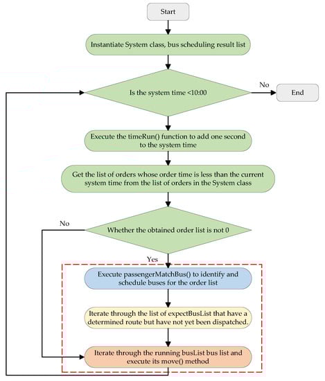 First of all, this part of the algorithm module needs to input the order data collection, the maximum passenger waiting time , and the number of seats of the bus and instantiate the list used to store the bus scheduling results, the System class responsible for bus scheduling, which needs to instantiate the list of available buses in the System bus number instantiation class, which relies on the class to implement. The class abstracts the real bus vehicles, and the core is used for driving to the next stop to record the driving information; the System class abstracts the scheduling class, and the core goal is to schedule as few buses as possible while satisfying the passenger waiting, and the System class relies on the Bus class to reproduce the ADPT algorithm to obtain the optimal bus scheduling solution. Figure 6 shows the design flowchart of ADPT algorithm in the case of morning peak (6:30–10:00) in the data set.