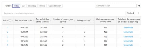 The bus class is used to execute the bus moving process; its execution process is as follows: determine whether the system time is equal to the departure time of the bus, and if so, the bus needs to depart. Find the order list of the Bus instance where the order is placed at that stop, the order time is less than the departure time, and the is 0. If the number of the list is not zero, then iterate through the orders to change the bit to 1 and calculate the waiting time of each order to obtain the maximum waiting time and the average waiting time, add the number of the list to the of the bus, and store the bus information in to indicate that the passenger is on board. The property of the bus is changed to the current departure time. If it is not equal, the arrival time of the bus to the next stop is calculated. If the present time is exactly equal to the arrival time, it means that the bus is running to the next stop, and similar to the departure stop, it is necessary to complete the passenger boarding operation at that stop and modify the relevant information. Modify the property of the bus to the arrival time. If the bus reaches the terminal and the number of passengers on board is not zero, the bus information will be saved in the bus scheduling result list and a True value will be returned, indicating the end of the bus operation. If the bus has not reached the terminal, then a value is returned, indicating that the bus has not yet finished its run.